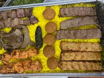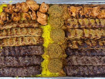 2 beef kabob / 2 chicken kabob / 2 beef chunk / 2 chicken chunk / 5 falafel & 6 pita
